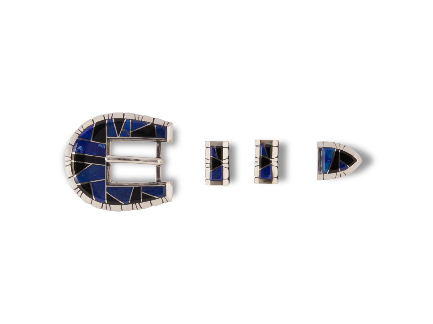 This buckle is made from hand polished Lapis gems inlaid into 925 silver. The Lapis stone features gold spots on a sea-deep shade of blue, easing the sharpness of understated garments.